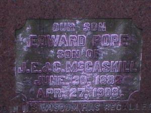 Edward Pope Mccaskill was born on 31 July 1883 at Hardeman Co., TN. 1 He was the son of John Edward McCaskill and Cynthia Sutton. Edward Pope Mccaskill died on 27 April 1909 at Hardeman Co., TN, at age 25. 1 He was buried after 27 April 1909 at Hickory Valley Cemetery, Hickory Valley, Hardeman Co., TN. 1