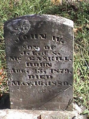 John William McCaskill1 (M) b. 25 August 1879, d. 16 May 1880 Pop-up Pedigree John William McCaskill was born on 25 August 1879 at Hardeman Co., TN. 1 He was the son of John Edward McCaskill and Cynthia Sutton. John William McCaskill died on 16 May 1880 at Hardeman Co., TN, at age 0. 1 He was buried after 16 May 1880 at Harris Cemetery #3, Hickory Valley, Hardeman Co., TN. 1