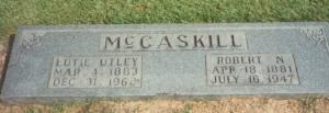 Robert Norman McCaskill1 (M) b. 15 April 1881, d. 16 July 1947 Pop-up Pedigree Robert Norman McCaskill was born on 15 April 1881 at Hickory Valley, Hardeman Co., TN. 2 He was the son of John Edward McCaskill and Cynthia Sutton. Robert Norman McCaskill married Lutie Jean Utley on 13 April 1905. 3 Robert Norman McCaskill died on 16 July 1947 at Gibson Co., TN, at age 66. 4 He was buried after 16 July 1947 at Mt. Zion Cemetery, Gibson Co., TN. 4