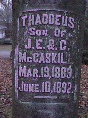 Thadeus McCaskill was born on 19 March 1889 at Hardeman Co., TN. 1 He was the son of John Edward McCaskill and Cynthia Sutton. Thadeus McCaskill died on 10 June 1892 at Hardeman Co., TN, at age 3. 1 He was buried after 10 June 1892 at Hickory Valley Cemetery, Hickory Valley, Hardeman Co., TN. 1