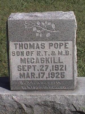 Thomas Pope McCaskill1 (M) b. 27 September 1921, d. 17 March 1925 Pop-up Pedigree Thomas Pope McCaskill was born on 27 September 1921 at Hardeman Co., TN. 1 He was the son of Richard Thomas McCaskill and Mae Belle Sutton. Thomas Pope McCaskill died on 17 March 1925 at Hardeman Co., TN, at age 3. 1 He was buried after 17 March 1925 at Mt. Comfort Cemetery, Hickory Valley, Hardeman Co., TN. 1