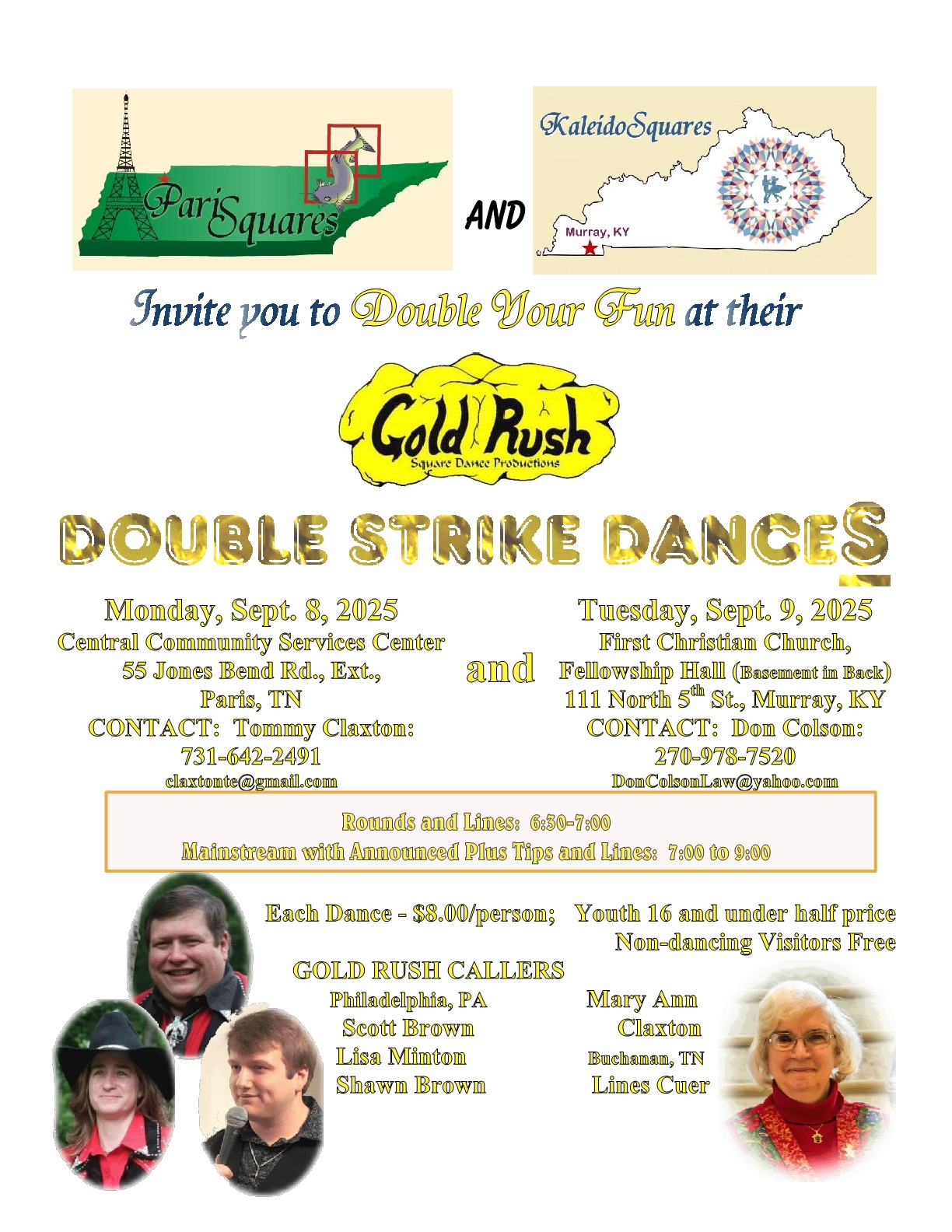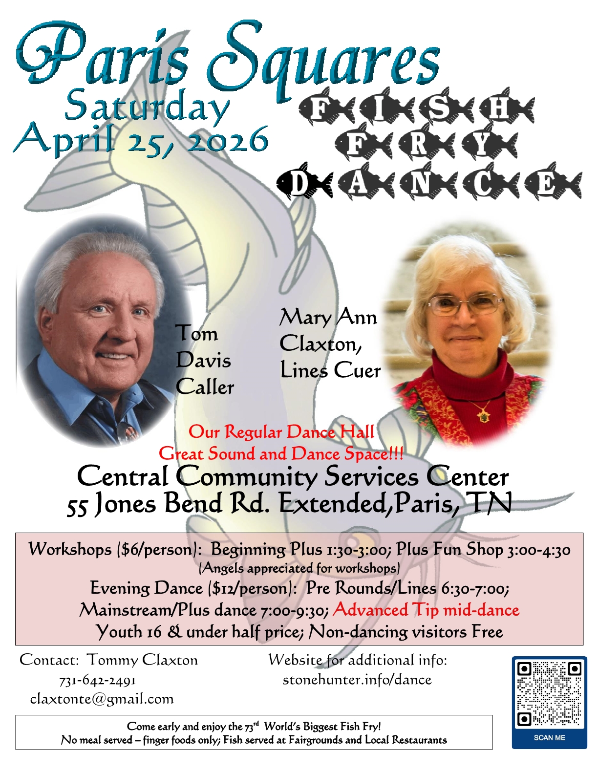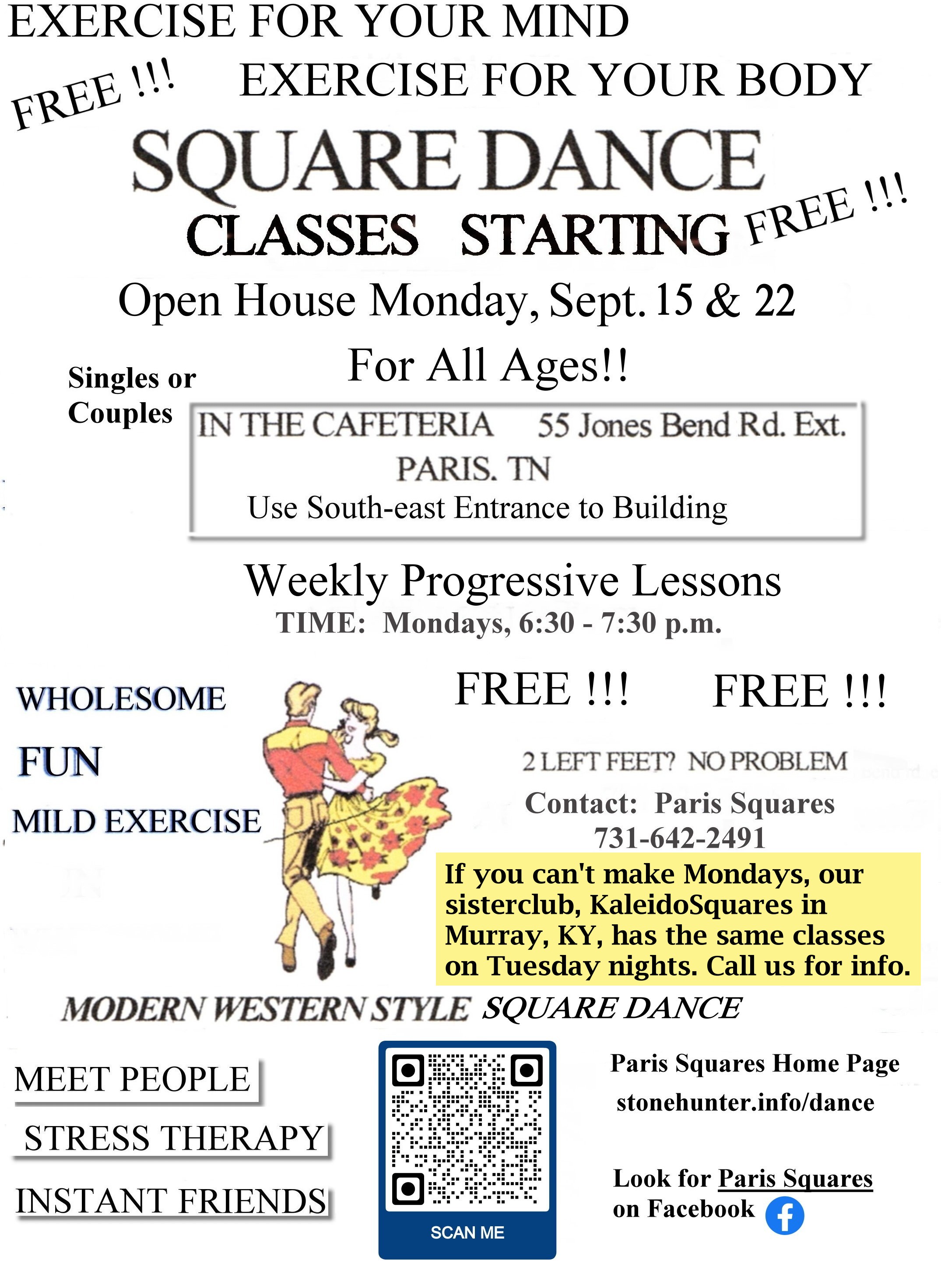 Central Community Services Center 55 Jones Bend Rd. Ext. Paris, TN (see map at left) Dance Monday nights, 7:00 - 9:00 except Memorial Day and Labor Day Contact: stonehuntr@yahoo.com 731-642-2491 Or check our Facebook Page for current schedules and/or changes: Paris Squares dances at Central Community Services Center in cooperation with the Henry County Office On Aging. Part of our agreement says that we do not charge for dances, so there is no charge for dancing or classes. Our classes usually start the Monday after Labor Day with two "open house" sessions which are introductory. Classes run from 6:30 to 7:30 with the club dance going from 7:30 to 9:00 on class nights. Class members are welcome to stay and watch the club dance. There are usually 15 lessons, one hour each week for 15 weeks. This takes dancers through Basic and Mainstream levels of dance. It is important to be willing to commit to regular attendance at classes as each class builds on what was learned in the previous class. We are a Mainstream and Plus level dance club, so after graduation from the Mainstream class, new dancers will begin to learn plus level calls. Click HERE for current class flyer. Below are some links to introduce you to Modern Western Square Dance and to demonstrate the Basic, Mainstream and Plus Calls. |
