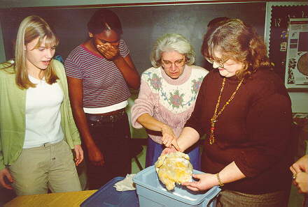 teacher Mary Ann Claxton (center) touching a partially mummified chicken